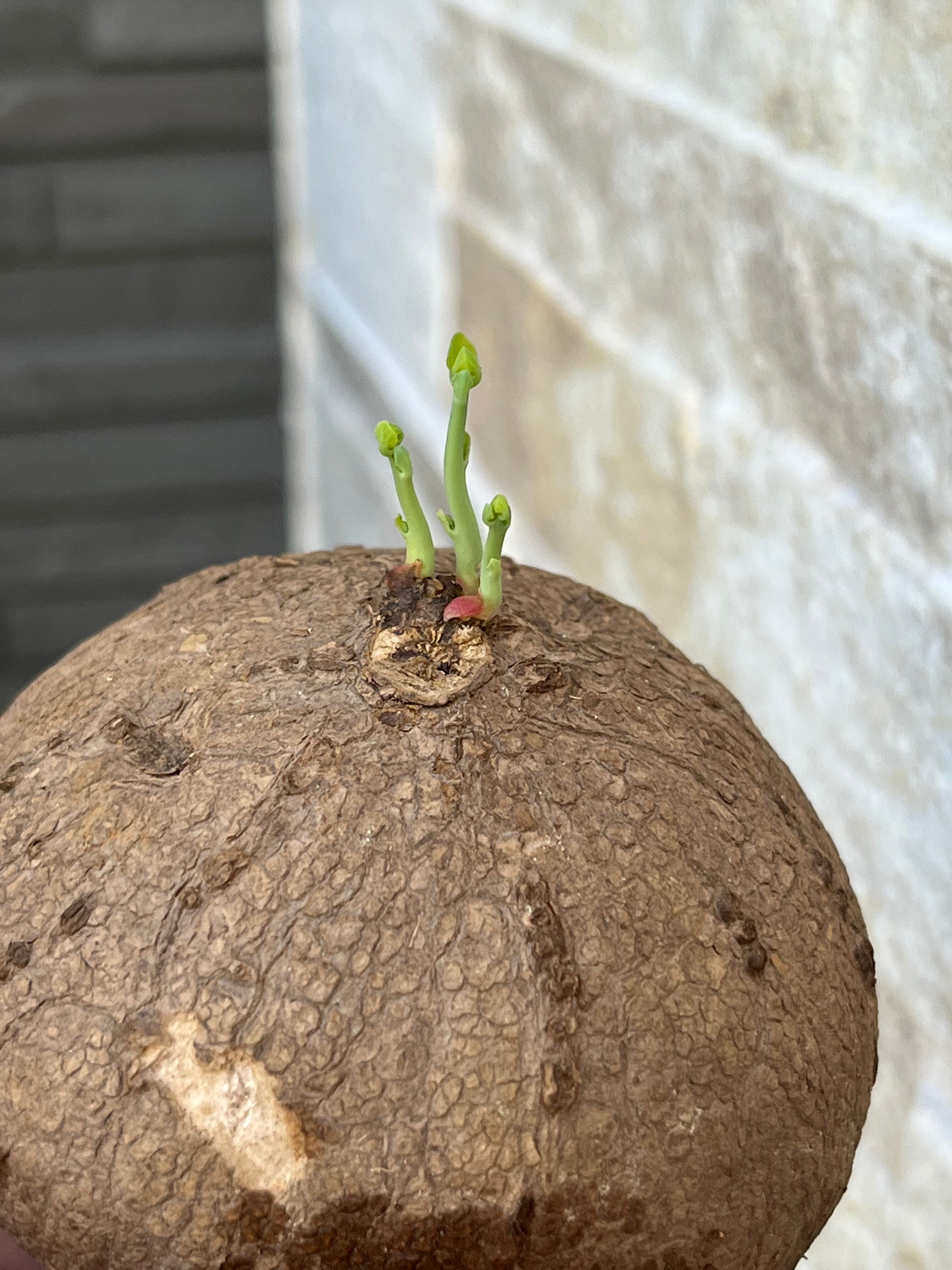 まるで芋様な塊根が特徴のステファニア。 暖かくなるとツルがひょろひょろっと長く伸びてその先に葉が開きます。